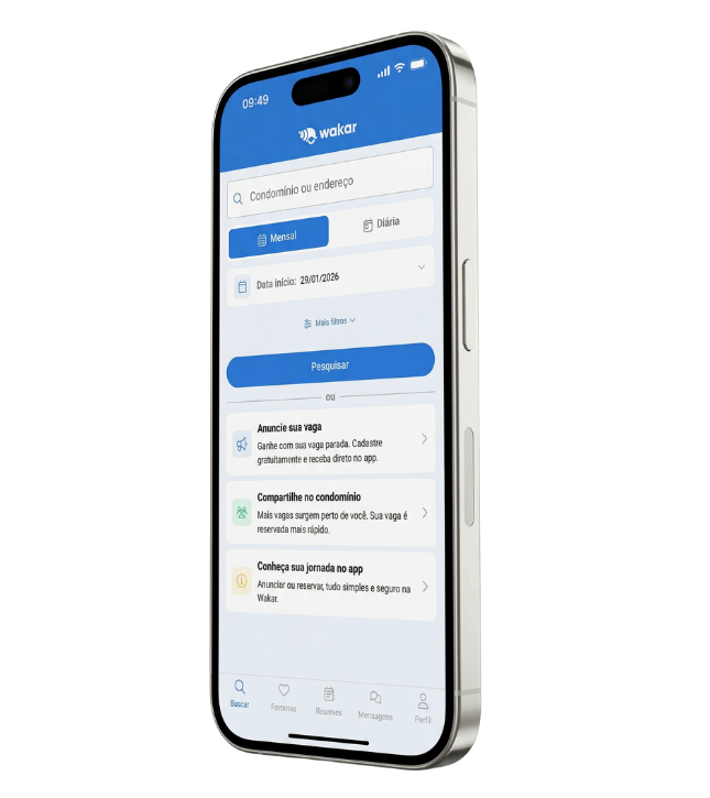 Apresentando a Wakar aos moradores do seu condomínio, você leva uma solução simples para organizar o uso das vagas entre vizinhos. Sem alterar regras ou segurança, sem gerar trabalho adicional ou custo para a administração. Uma iniciativa prática e digital que melhora o dia a dia de todos, aproveitando de forma inteligente as vagas que já existem.